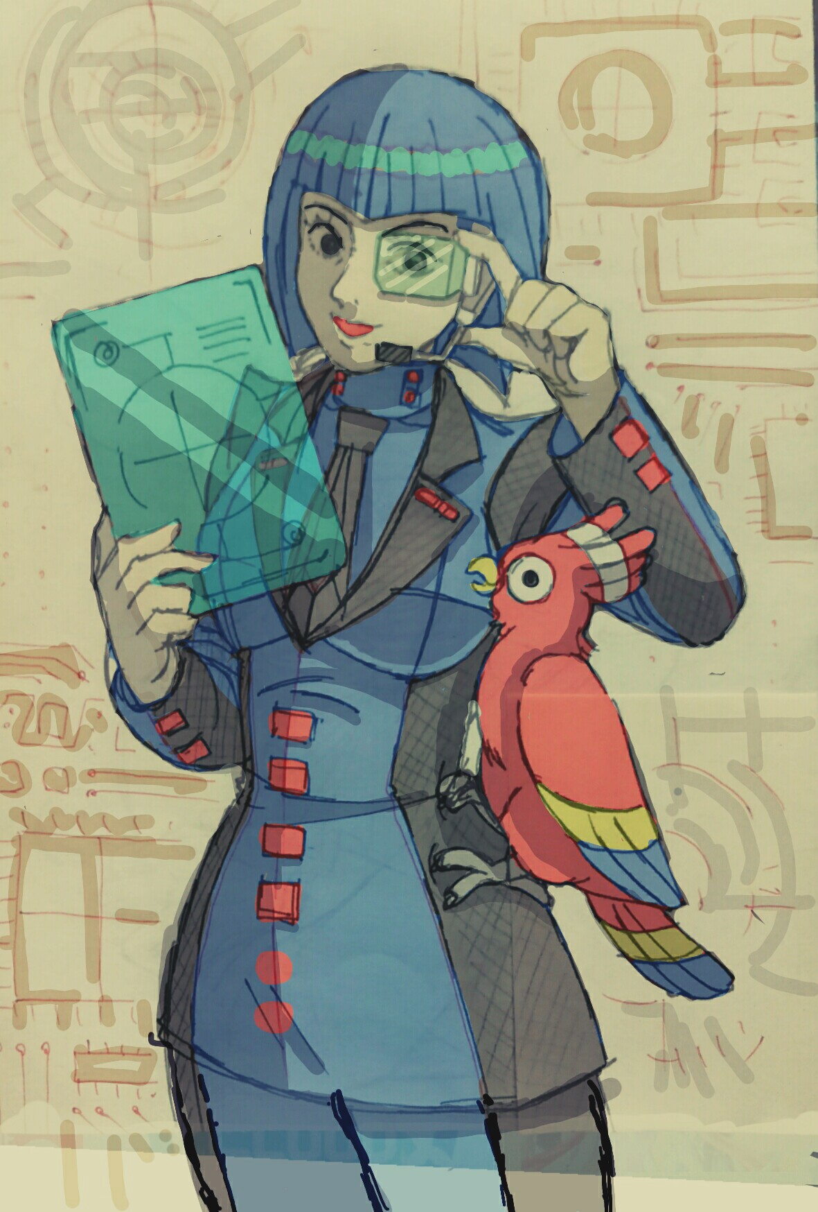 手に持ってるの透明タブレットイメージですがそれだとパーツ作りで死にそうなので向こう側折角描いたけど普通のにした方が良さそう。