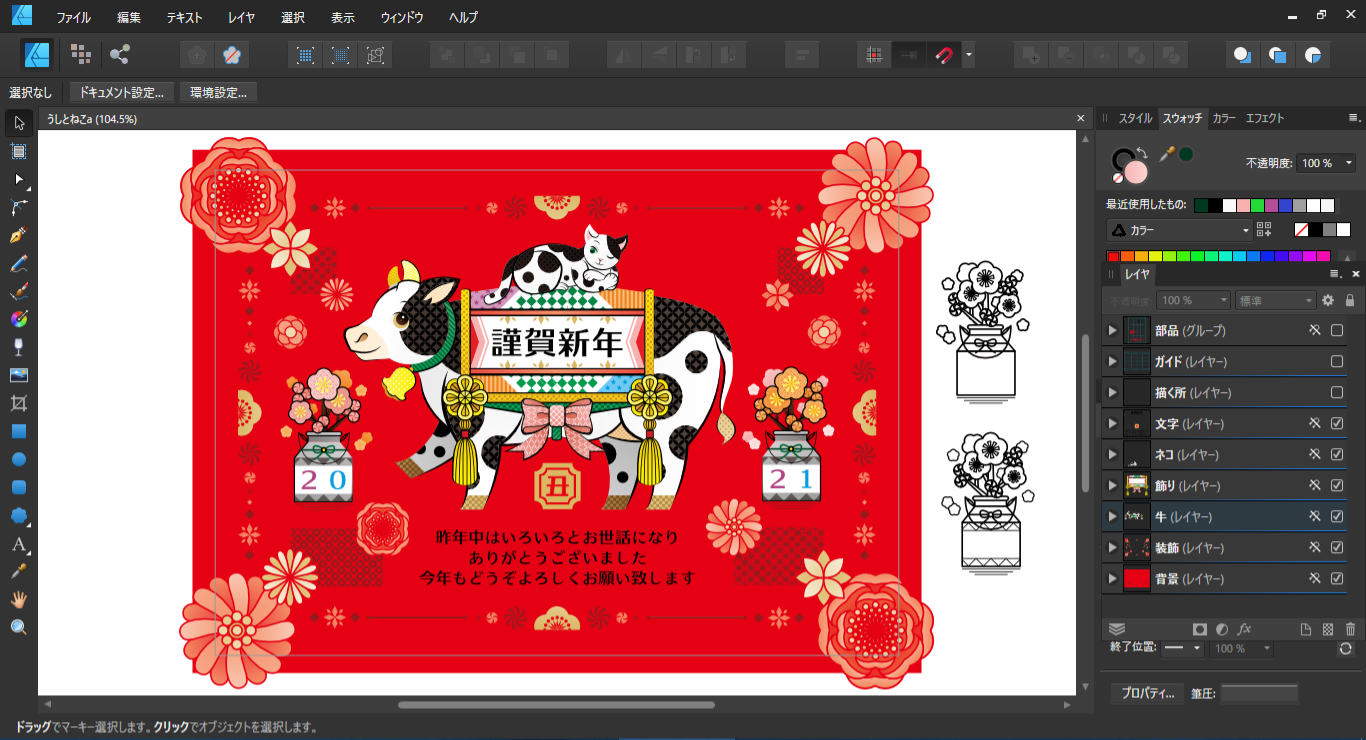 【タグ】オリジナルイラスト オリジナルデザイン 牛猫 丑年年賀状 丑年イラスト 年賀状デザイン 塗り絵用線画 AffinityDesigner アフィニティデザイナー ベクターイラスト