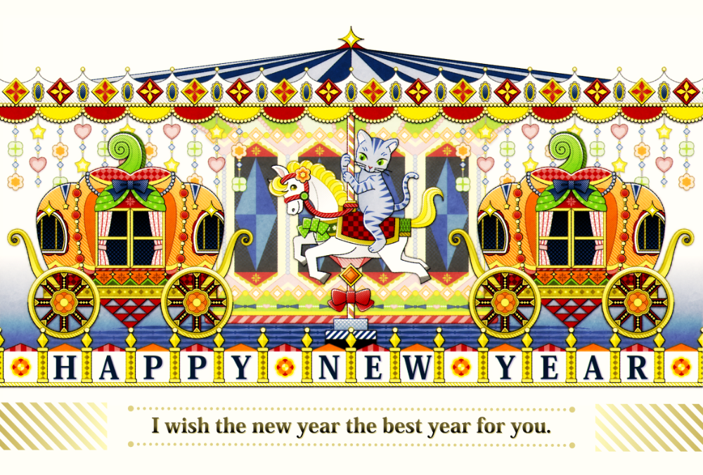 【無料配布用】2026年・令和8年・午年イラスト年賀状デザイン「MERRY-GO-ROUND」HAPPY NEW YEAR & ぬりえ/Affinity V3 使用