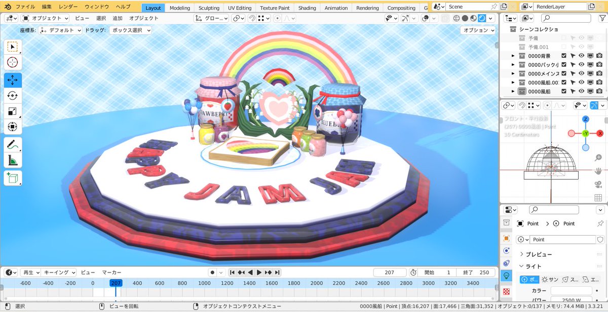 背景ステージは昔作ったものを少し改変していますがBlenderのバージョンもシェーダーも違うせいか別物レベルで綺麗になりました。